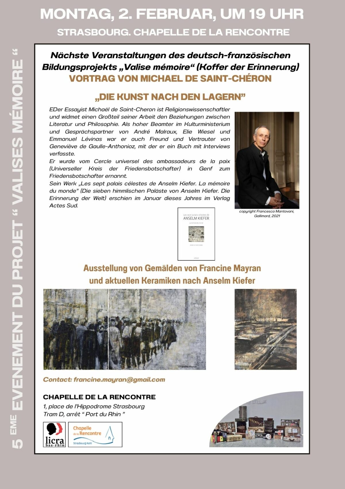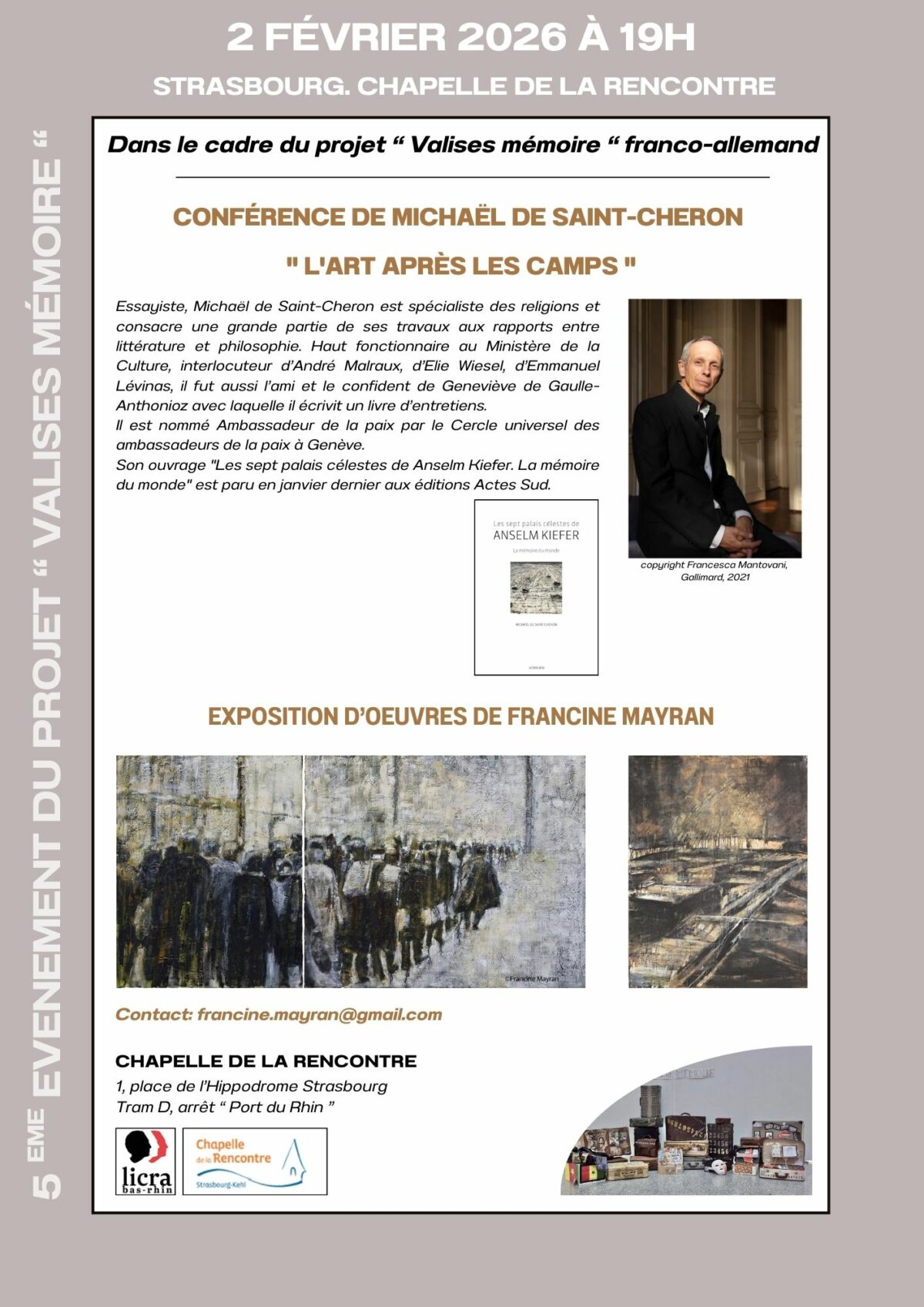 Conférence de Michaël de Saint-Chéron « L’art après les camps » et la présentation de son ouvrage « Les 7 palais célestes de Anselm Kiefer. La mémoire du monde » qu’il pourra dédicacer. Associé à une visite de l’exposition de Francine Mayran (peintures et céramiques récentes d’après Anselm Kiefer).