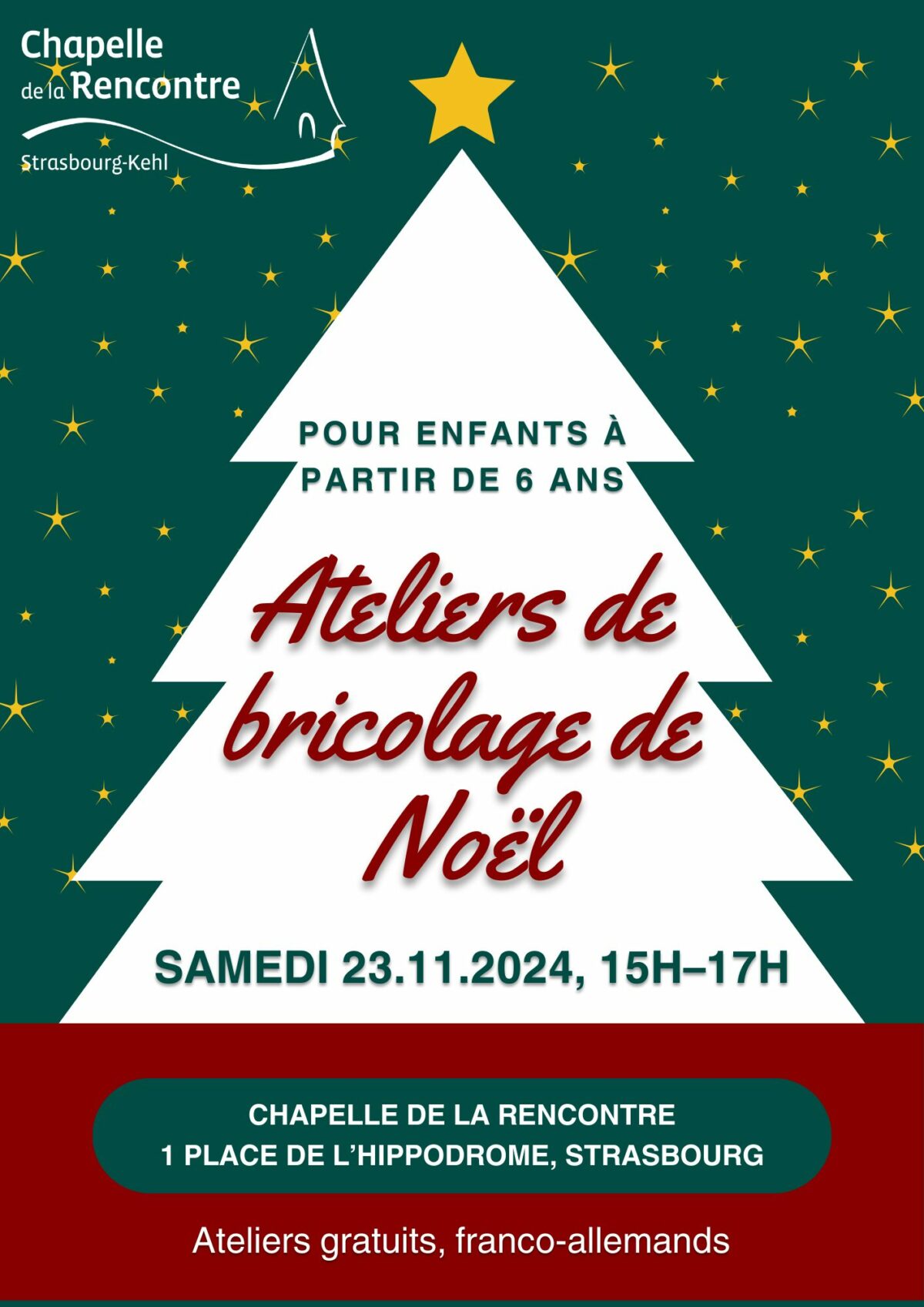 Nous préparerons des petits gâteaux de Noël (« bredele ») ainsi que des bricolages pour le sapin de Noël qui se trouve chaque année sur la place de l’Hippodrome.