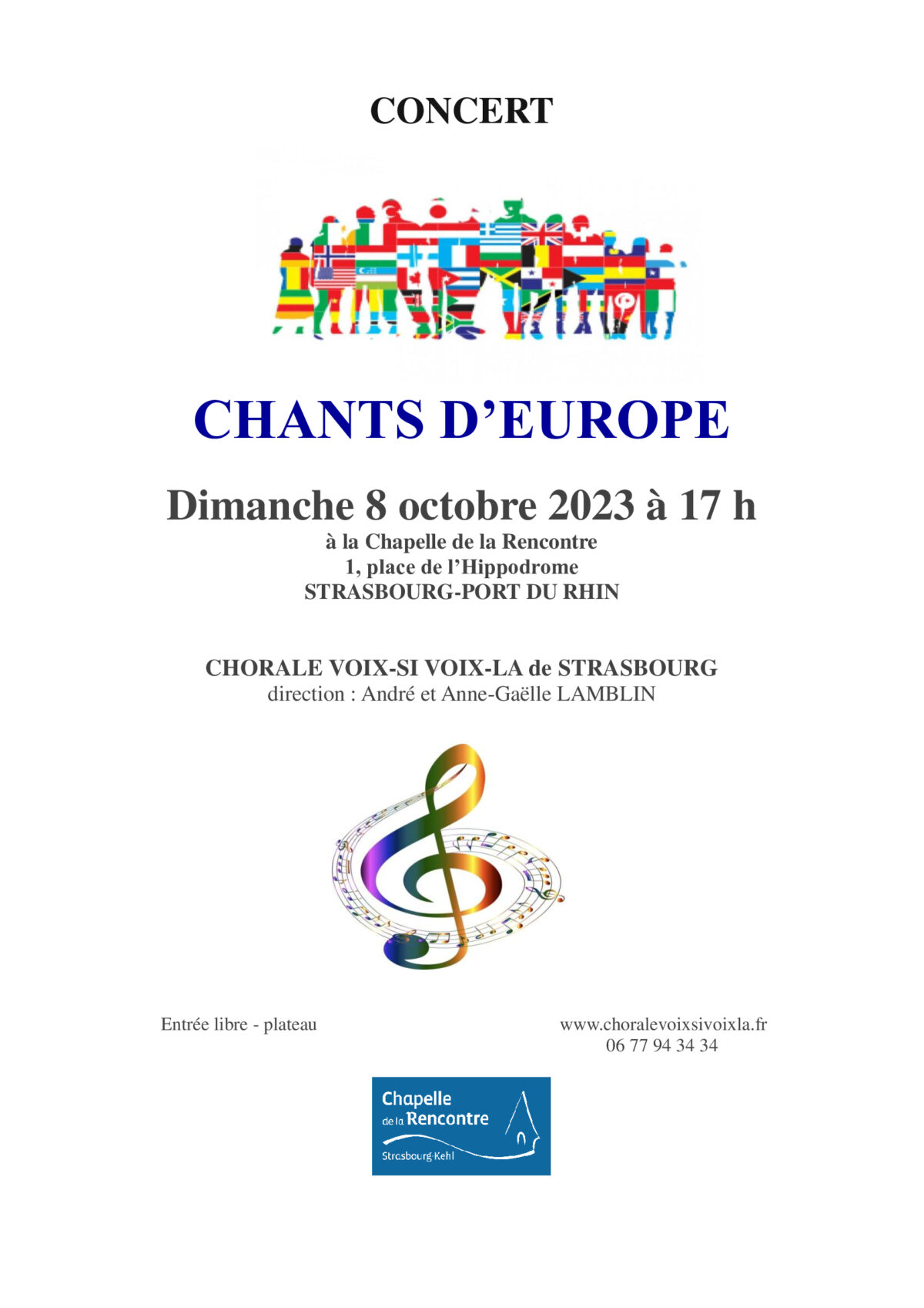 Concert « Chants d’Europe » dimanche 08.10 à 17h à la Chapelle de la Rencontre avec la chorale Voix-Si Voix-La. Le concert entrainera le public en chansons de toutes époques et tous styles, données en différentes langues, à travers l’Europe du Nord au Sud, et se conclura par « An die Freude » (Ode à la Joie) de Beethoven-Schiller. Entrée libre, plateau.