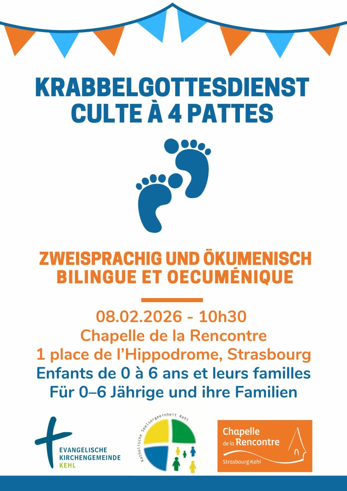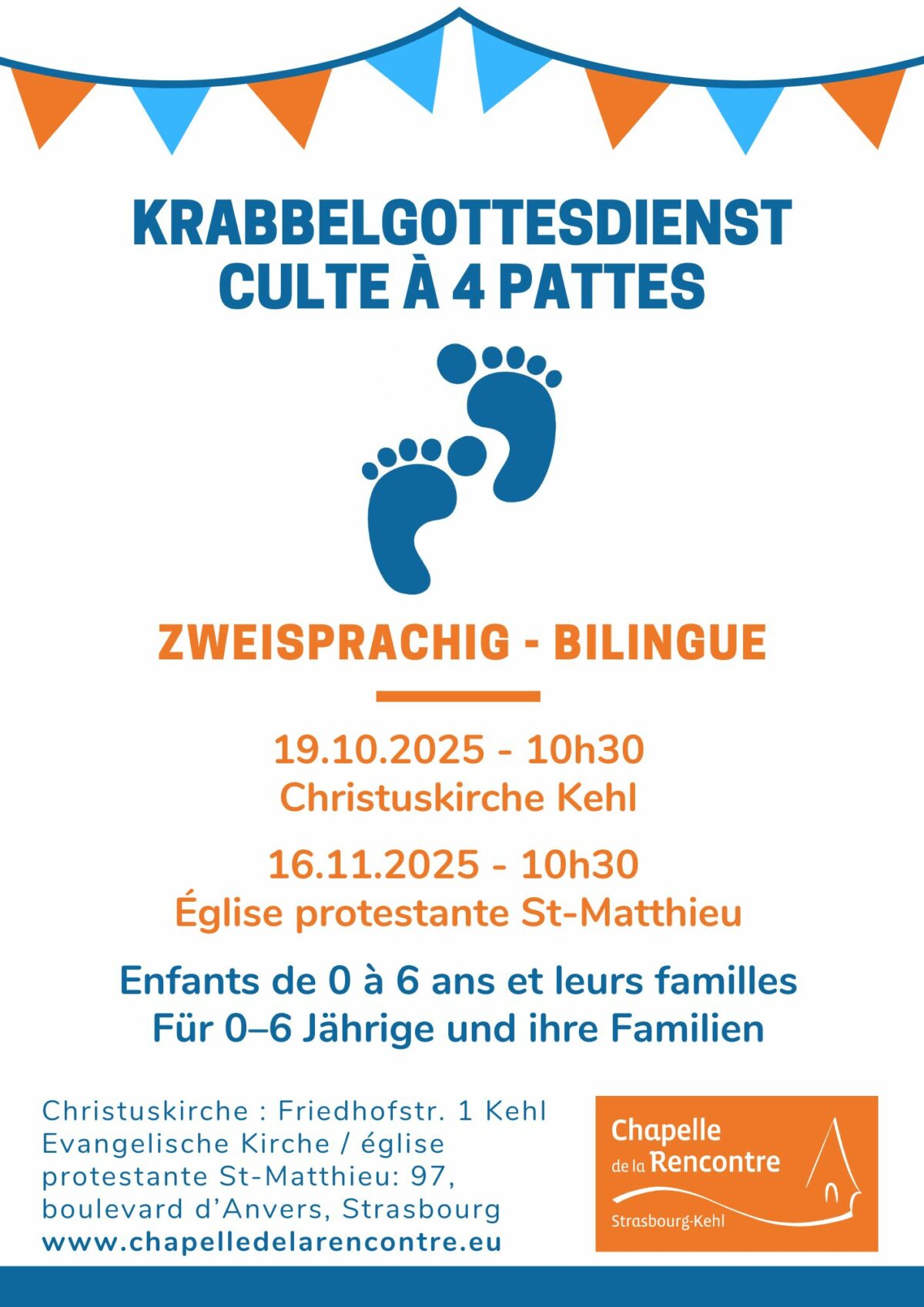 Die Krabbelgottesdienste richten sich an Kinder bis 6 Jahre alt, begleitet von ihrer Familie. Aber vielleicht haben etwas ältere Kinder auch Lust, Mal vorbeizuschauen? Wir singen, bewegen uns, lesen eine Geschichte aus der Bibel und beten… auf Deutsch und auf Französisch! Und unser Schäfchen macht natürlich mit. Der Gottesdienst dauert etwa 30 Minuten.