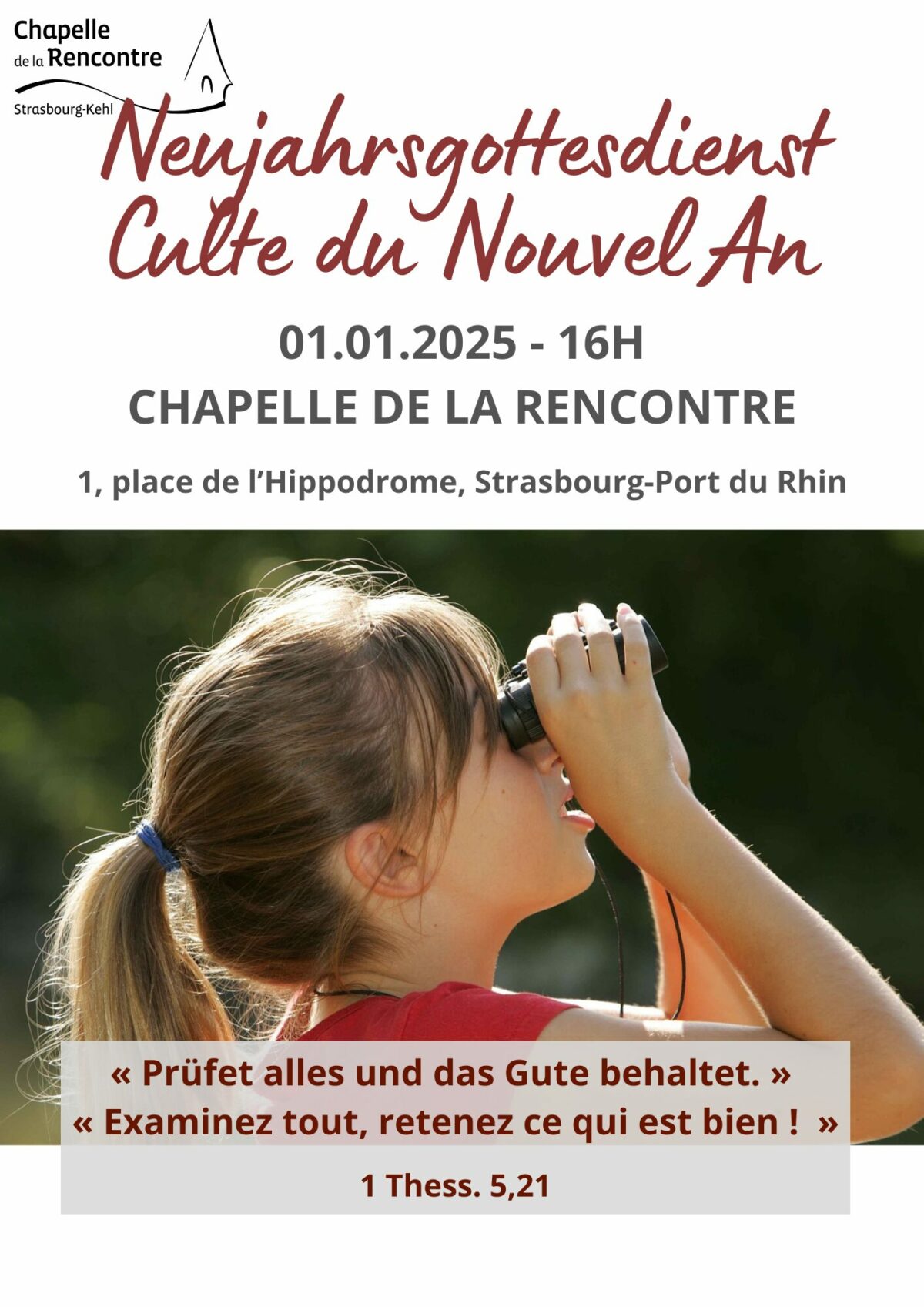 Französische und deutsche Protestanten beginnen gemeinsam das Neue Jahr. Rund um die Jahreslosung für 2025: „Prüfet alles und das Gute behaltet.“ (1. Thess. 5, 21). Im Anschluss Begegnung bei Sekt und Neujahrsbrezel.