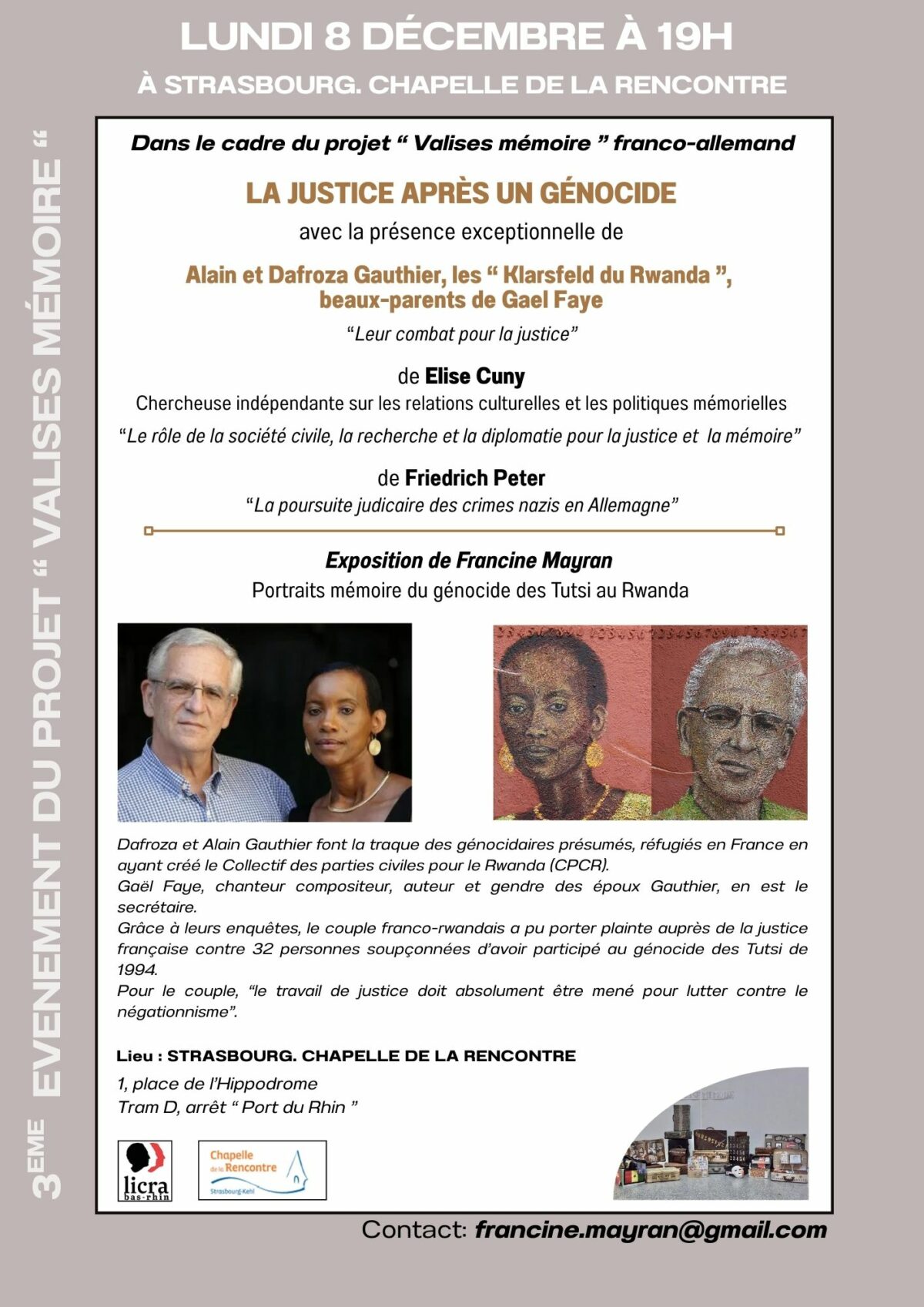 Plusieurs autres axes seront abordés avec la chercheuse indépendante Elise Cuny (sur le rôle de la société civile, la recherche et la diplomatie pour la justice et la mémoire), avec l’historien Friedrich Peter (sur la justice des crimes nazis), et avec l’artiste de mémoire et psychiatre Francine Mayran, sur la justice après le génocide arménien et de l’opération Némésis. Francine Mayran présentera également quelques portraits peints du génocide des Tutsi au Rwanda.
