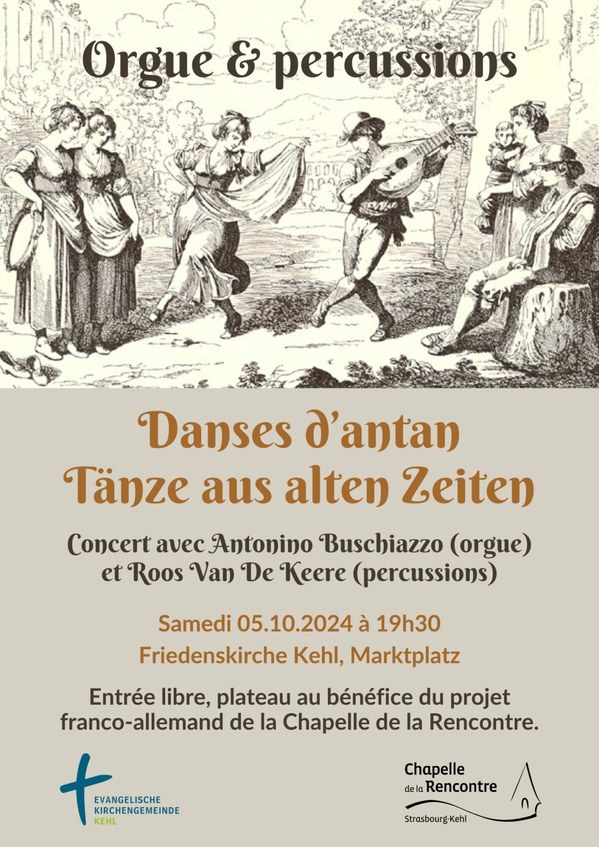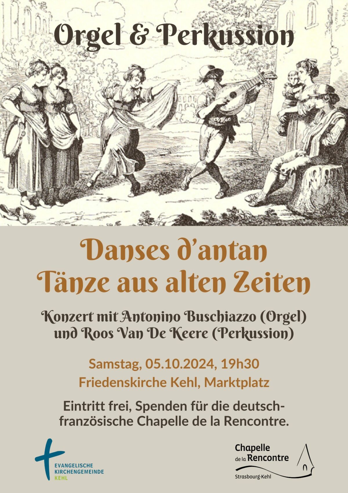 Es ist ungewöhnlich, dass die Orgel Tänze interpretiert. Auch die beiden Musizierenden bilden ein ungewöhnliches Duo: der argentinische Organist Antonino Buschiazzo wird von der belgischen Pfarrerin Roos Van De Keere mit verschiedenen Perkussionsinstrumenten begleitet. Das Konzert wird Sie mitnehmen auf eine Reise durch Europa und Lateinamerika und Ihnen Lust machen, sich zu den Rhythmen vergangener Zeiten zu bewegen.