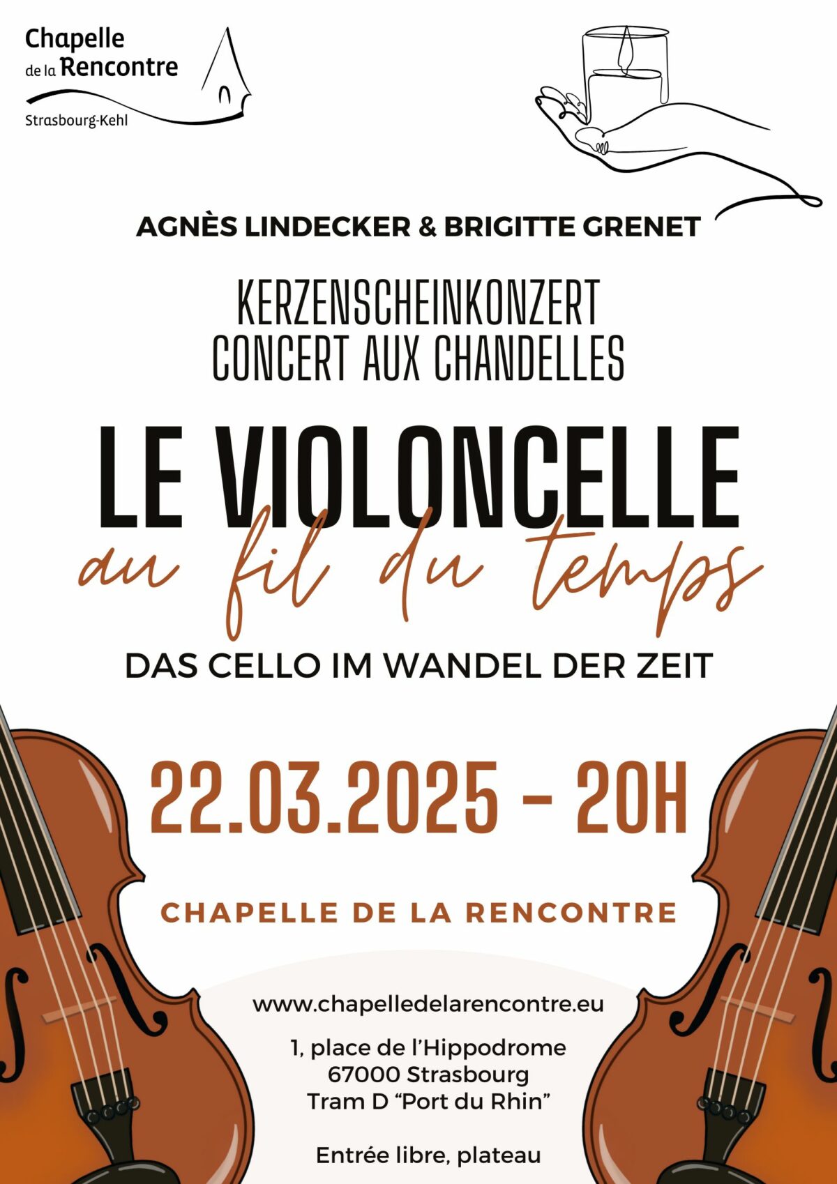 Les violoncellistes Agnès Lindecker et Brigitte Grenet interprètent des pièces de Kodály, Telemann, Vivaldi, Marcello, Corette, Lee. Elles jouent dans le pénombre, à la lueur des chandelles, pour inciter le public à aiguiser l’ouïe  lors de ce concert.