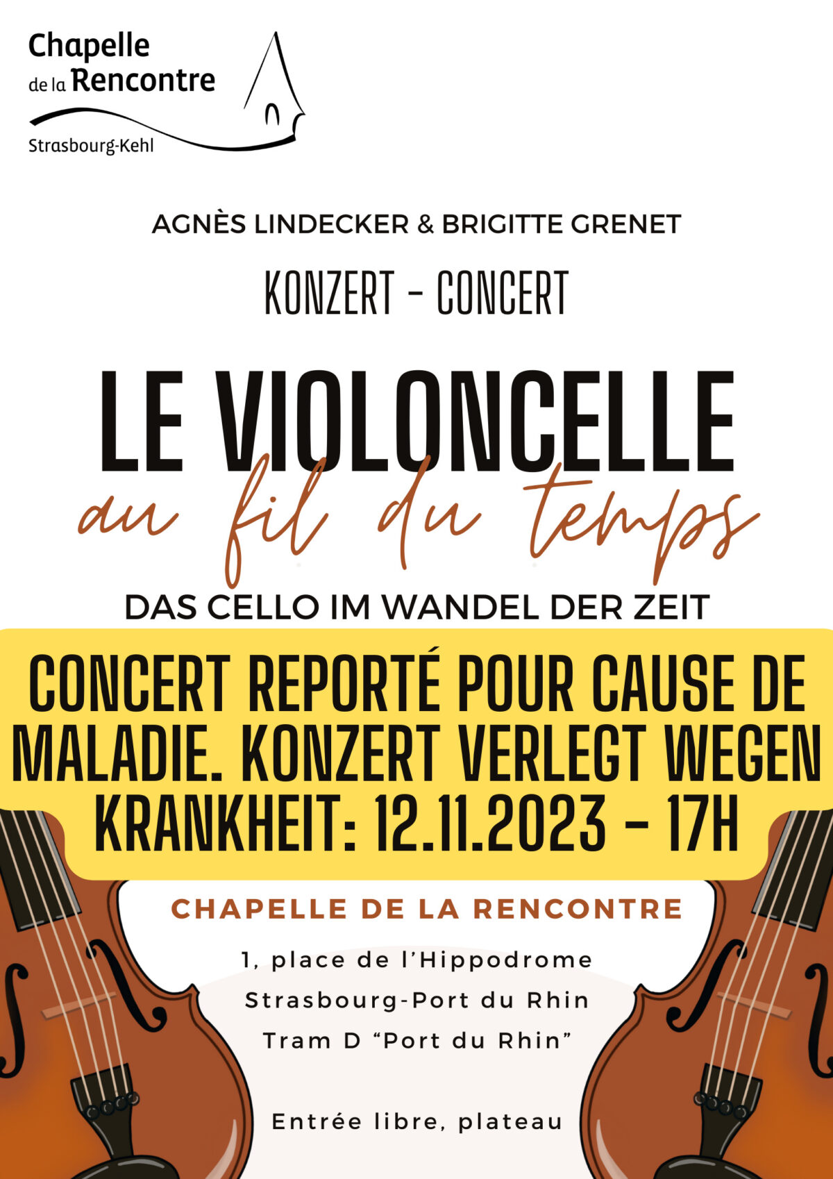 Le concert « Le violoncelle au fil du temps », initialement programmé ce dimanche 24 septembre à 17h est malheureusement reporté au dimanche 12 novembre à 17h pour cause de maladie d’une des deux violoncellistes. Nous lui souhaitons un bon rétablissement et vous remercions pour votre compréhension.
