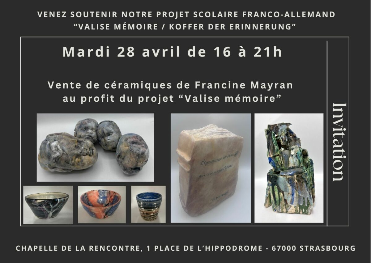 Vente de céramiques de l’artiste Francine Mayran au profit du projet scolaire et franco-allemand « Valise mémoire ». Un projet transfrontalier pour lutter contre le racisme, l’antisémitisme et les discriminations, mis en place par l’artiste Francine Mayran et parrainé par Mme Heike Thiele, ambassadrice d’Allemagne au Conseil de l’Europe.